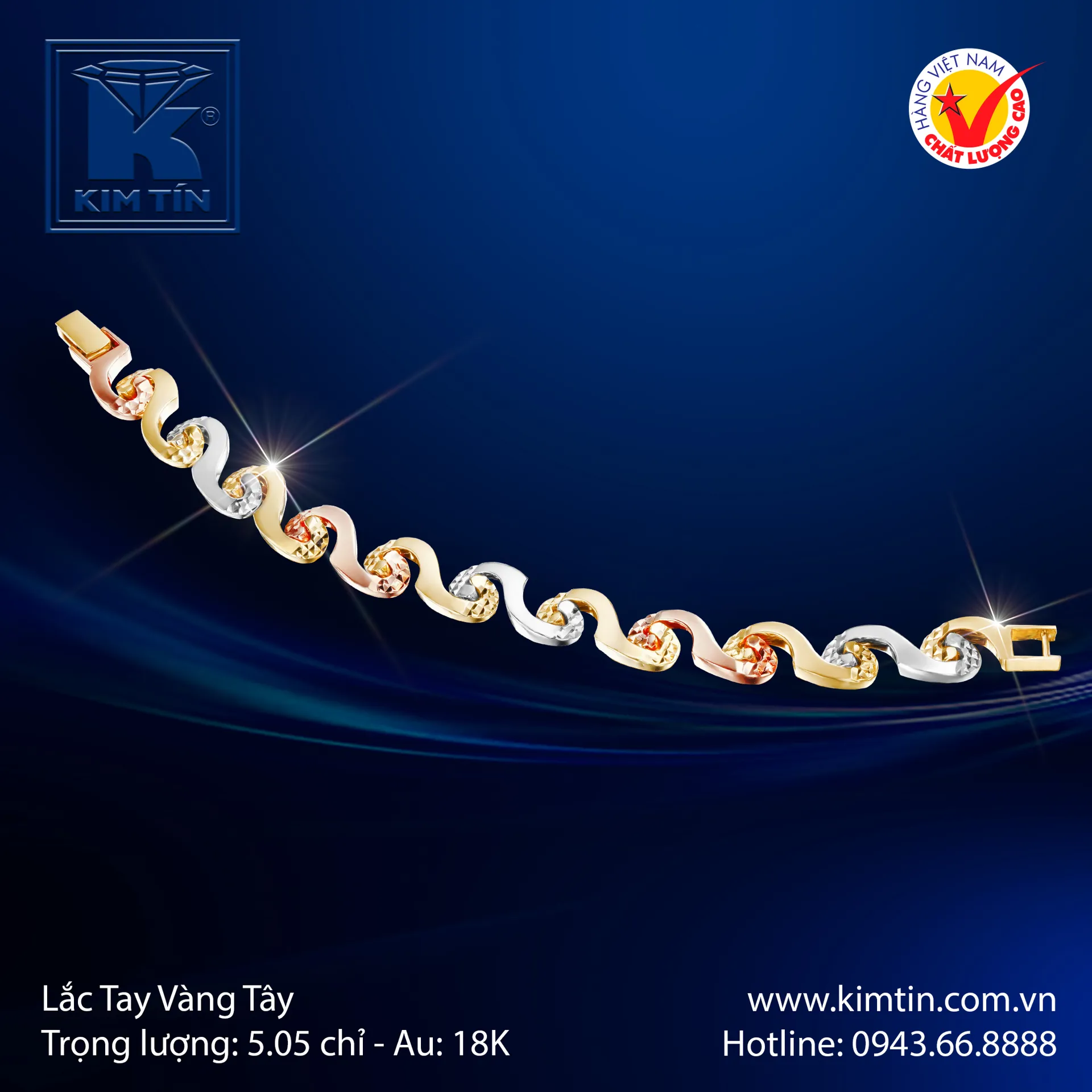 Được chế tác từ vàng tây 18K (Au 750) cao cấp, lắc tay nổi bật với thiết kế dáng uốn lượn mềm mại, tạo nên sự uyển chuyển và cuốn hút trong từng chi tiết. Sự kết hợp hoàn hảo giữa ba sắc vàng – vàng rực rỡ, trắng tinh khôi và hồng thời thượng – mang lại vẻ đẹp độc đáo, hiện đại và không kém phần sang trọng.