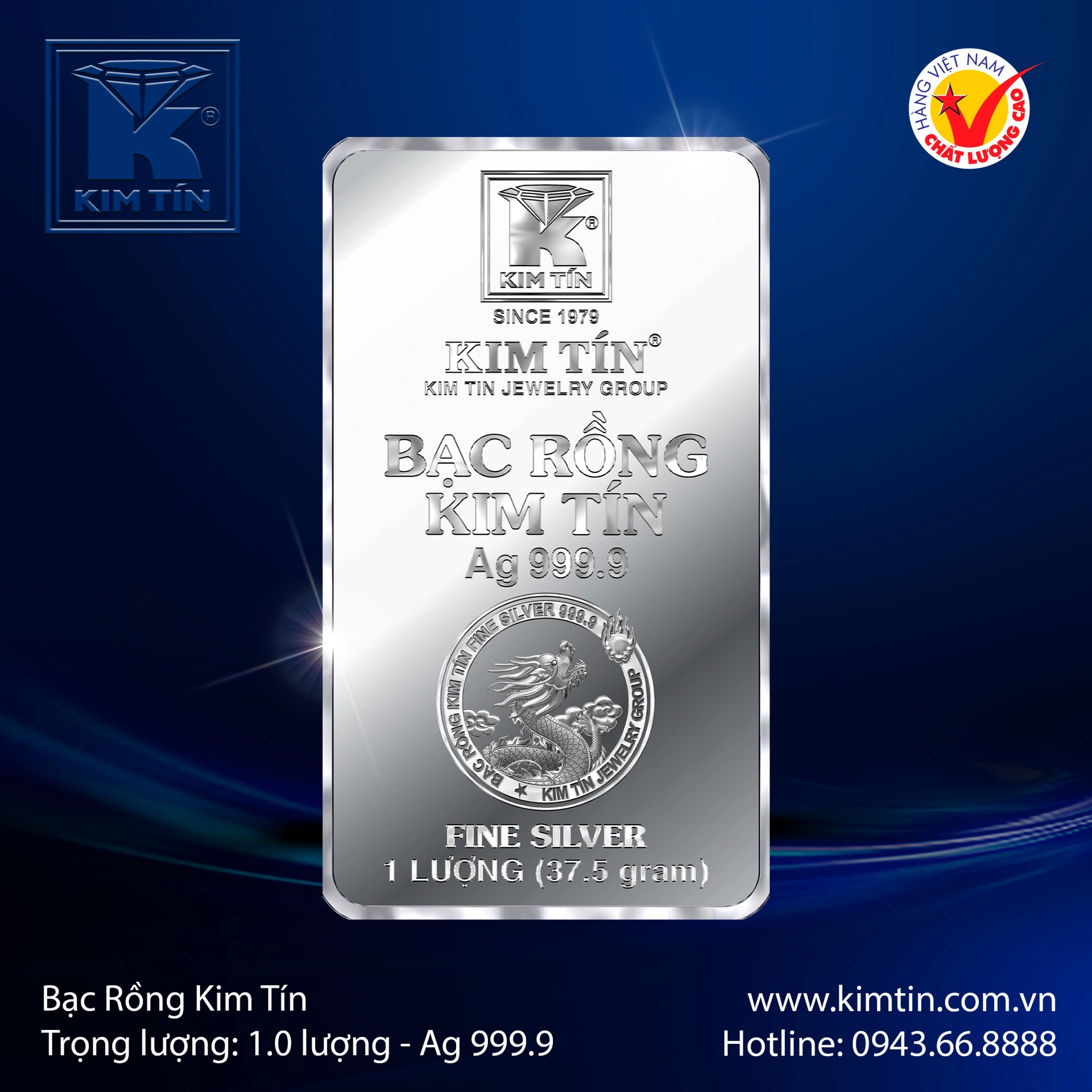 Thiết kế tinh xảo: Dạng thỏi bạc hình chữ nhật, bề mặt khắc laser sắc nét với logo Kim Tín, dòng chữ Bạc Rồng 999.9 Fine Silver và mã QR xác thực nguồn gốc.