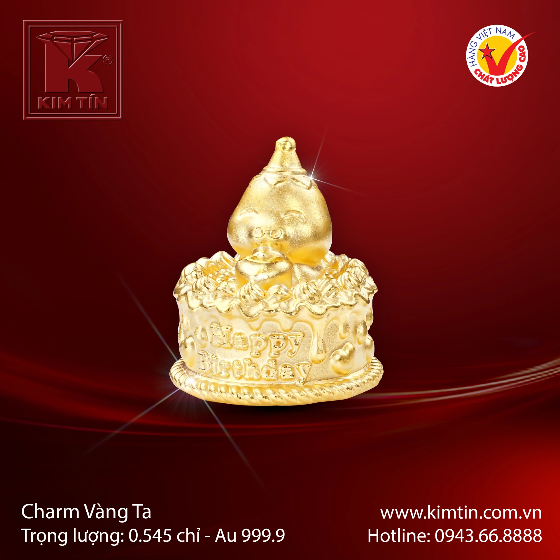 Charm được chế tác hoàn toàn từ Vàng Ta 24K nguyên chất, đạt độ tinh khiết tuyệt đối Au 999.9. Sắc vàng rực rỡ, lấp lánh khẳng định giá trị đầu tư và sự thịnh vượng. Với trọng lượng tham khảo 0.545 chỉ, đây là một món quà giá trị, mang tính kỷ niệm cao.