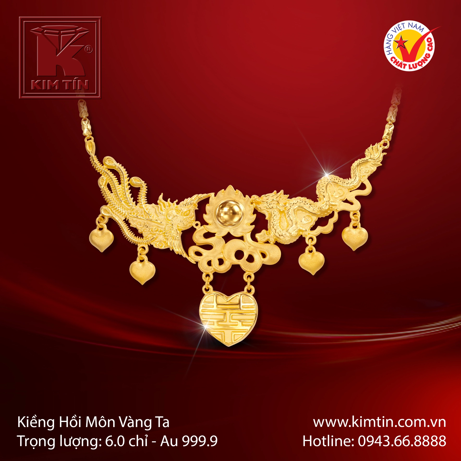 Là tinh hoa của nghệ thuật kim hoàn truyền thống, chiếc kiềng mang trong mình hình tượng "Long Phụng Giao Hòa" – biểu tượng kinh điển cho sự gắn kết âm dương, một lời chúc phúc thiêng liêng về một cuộc hôn nhân hạnh phúc, bền chặt và sung túc. 👩❤️👨✨