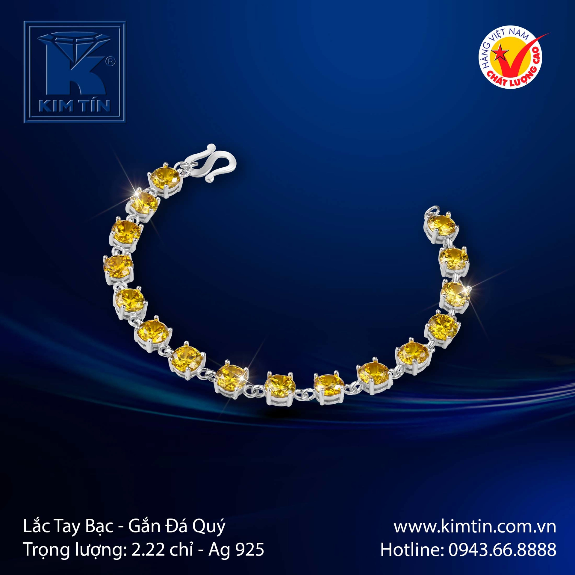 Lắc tay được thiết kế theo phong cách Tennis Bracelet hoặc chuỗi liên kết đối xứng, toàn bộ bề mặt được tạo nên từ chuỗi các viên Đá Màu Vàng Hoàng Kim (Yellow Citrine/CZ) được cắt giác tròn và đính tinh xảo trên khung bạc: