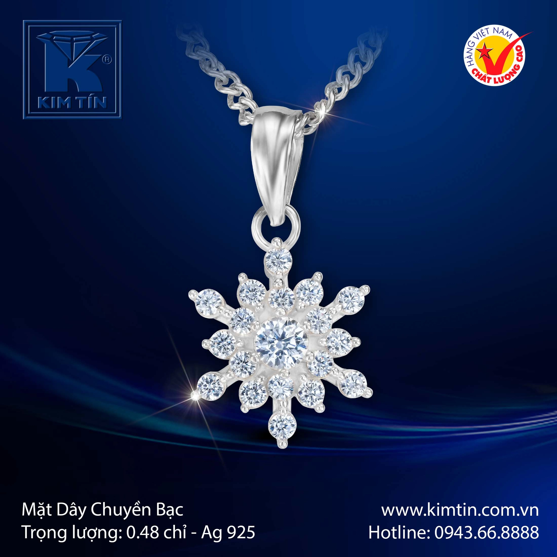 Điểm nhấn tuyệt đối nằm ở tạo hình hoa tuyết sáu cánh cân đối hoàn hảo, một biểu tượng của sự may mắn và niềm vui trong trẻo. Viên đá chủ lớn ngự trị ở trung tâm tựa như trái tim băng giá đang tỏa sáng lấp lánh, được bao bọc bởi hàng loạt viên đá nhỏ hơn đính kết tỉ mỉ trên từng nhánh hoa. Sự sắp xếp tài tình này tạo nên hiệu ứng thị giác bùng nổ, khiến mặt dây chuyền phản chiếu ánh sáng rực rỡ tựa như ngàn vì sao đang nhảy múa trên cổ nàng. ✨💎