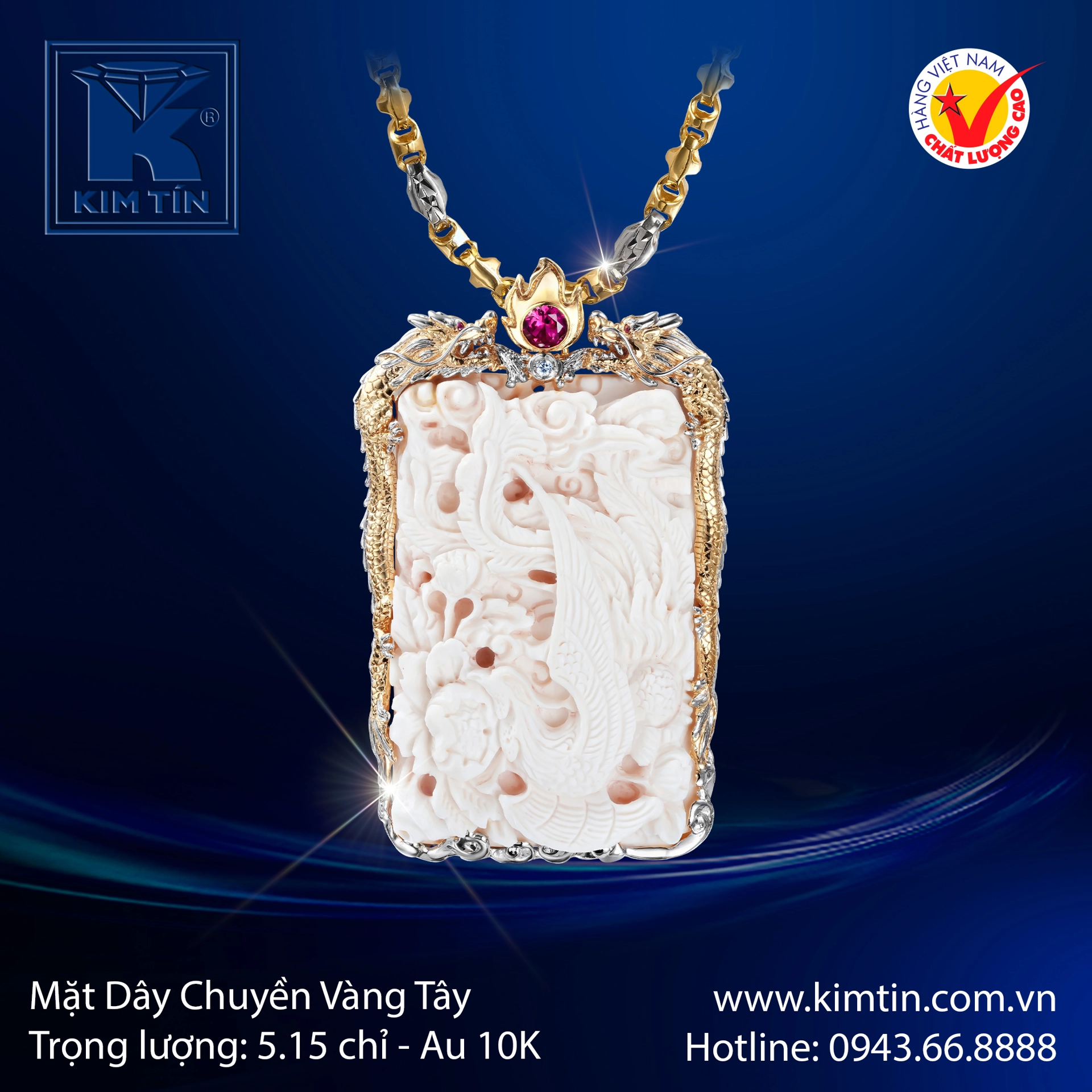 Mặt dây chuyền vàng tây 10K là sự kết hợp tinh hoa giữa nghệ thuật chế tác thủ công tinh xảo và ý nghĩa phong thủy sâu sắc. Từng đường nét chạm khắc sống động, khắc họa hình tượng long phụng uy nghiêm – biểu tượng của quyền lực, thịnh vượng và sự trường tồn.