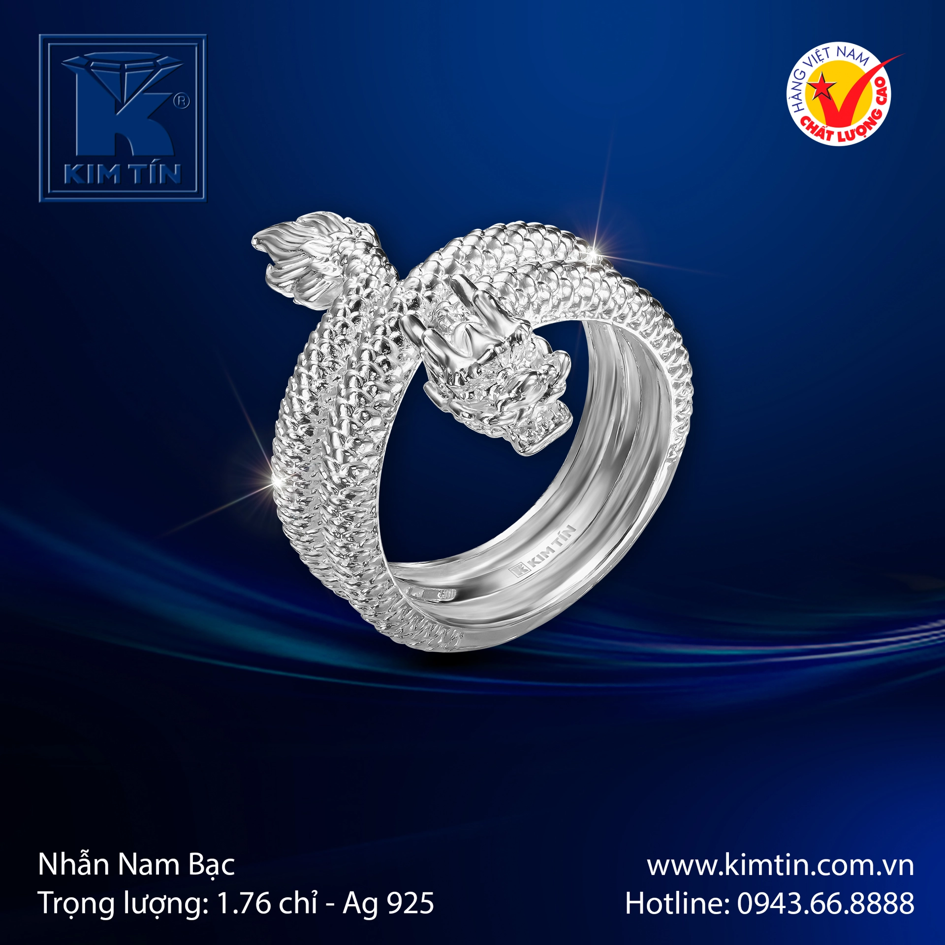 Chiếc nhẫn nam bạc của Kim Tín là một kiệt tác trang sức, nổi bật với thiết kế Rồng uy dũng được chế tác vô cùng tinh xảo. Hình ảnh Rồng quấn quanh thân nhẫn không chỉ là biểu tượng của sức mạnh 💪, quyền lực ✨ và may mắn 🍀 trong văn hóa Á Đông mà còn mang đến một vẻ ngoài lịch lãm, cá tính và đầy uy thế cho người đeo.