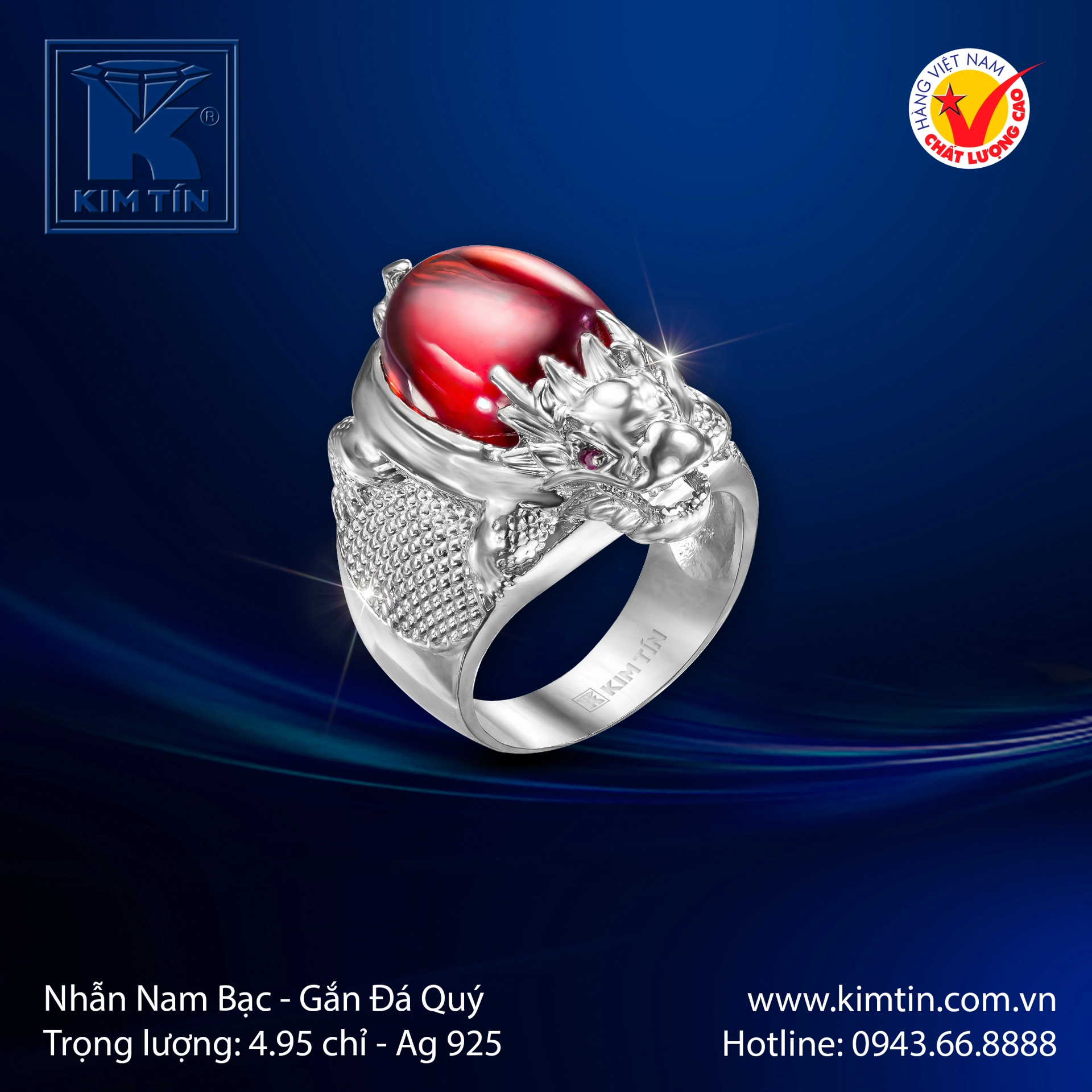 Chiếc nhẫn nam bạc 925 mang biểu tượng rồng quyền lực, kết hợp cùng viên đá đỏ huyết long nổi bật, tạo nên phong cách uy nghi – mạnh mẽ – đầy khí chất cho phái mạnh.