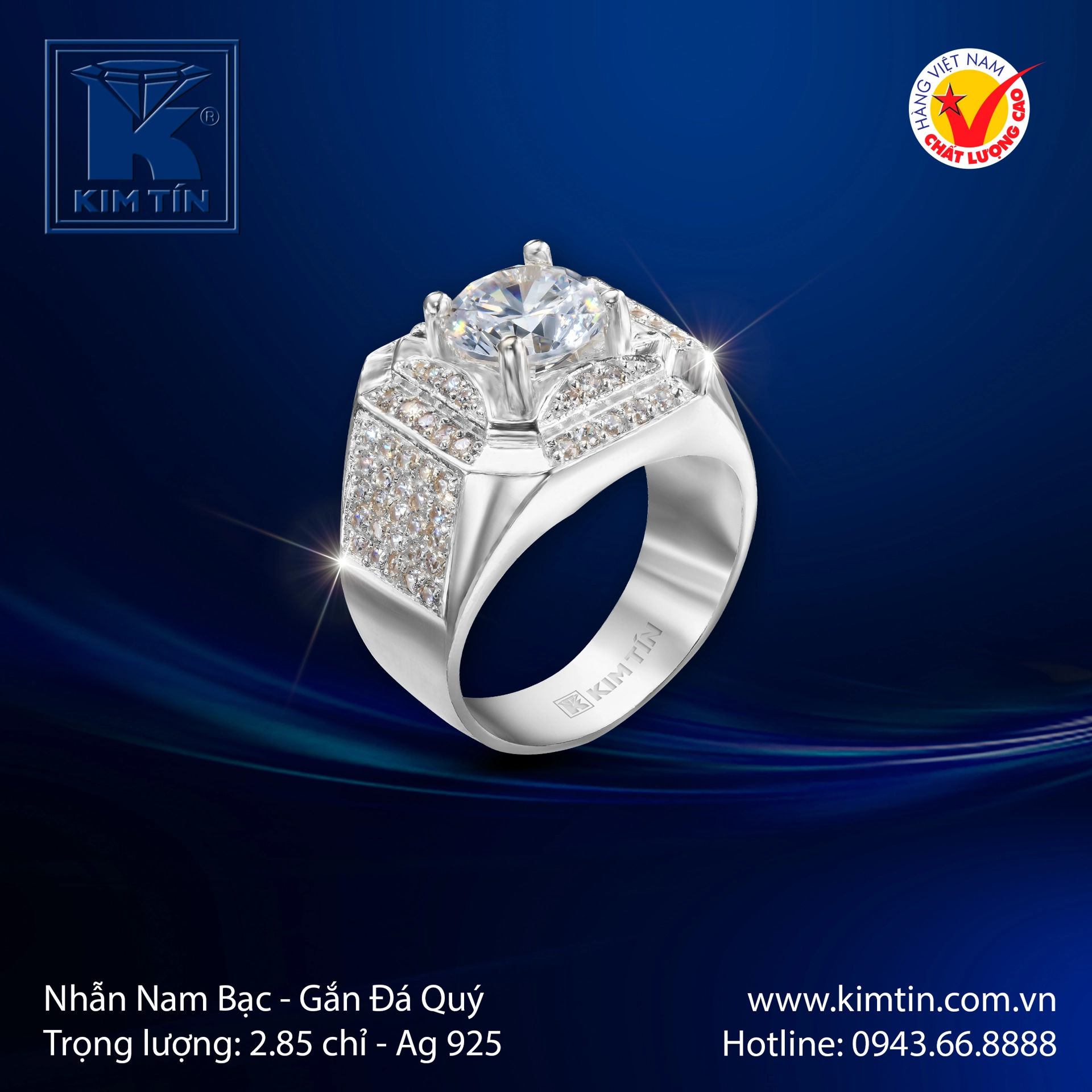 Chiếc nhẫn nam bạc của Kim Tín là hiện thân của sự xa hoa, thịnh vượng và phong thái đỉnh cao. Viên Đá Chủ Lớn (giả kim cương/CZ) ở trung tâm được nâng đỡ một cách kiêu hãnh, bao quanh là hàng loạt đá tấm lấp lánh được đính dày đặc trên toàn bộ mặt và vai nhẫn. Thiết kế này tạo ra một hiệu ứng ánh sáng tuyệt đẹp, khẳng định vị thế không thể chối từ của người đeo 👑.