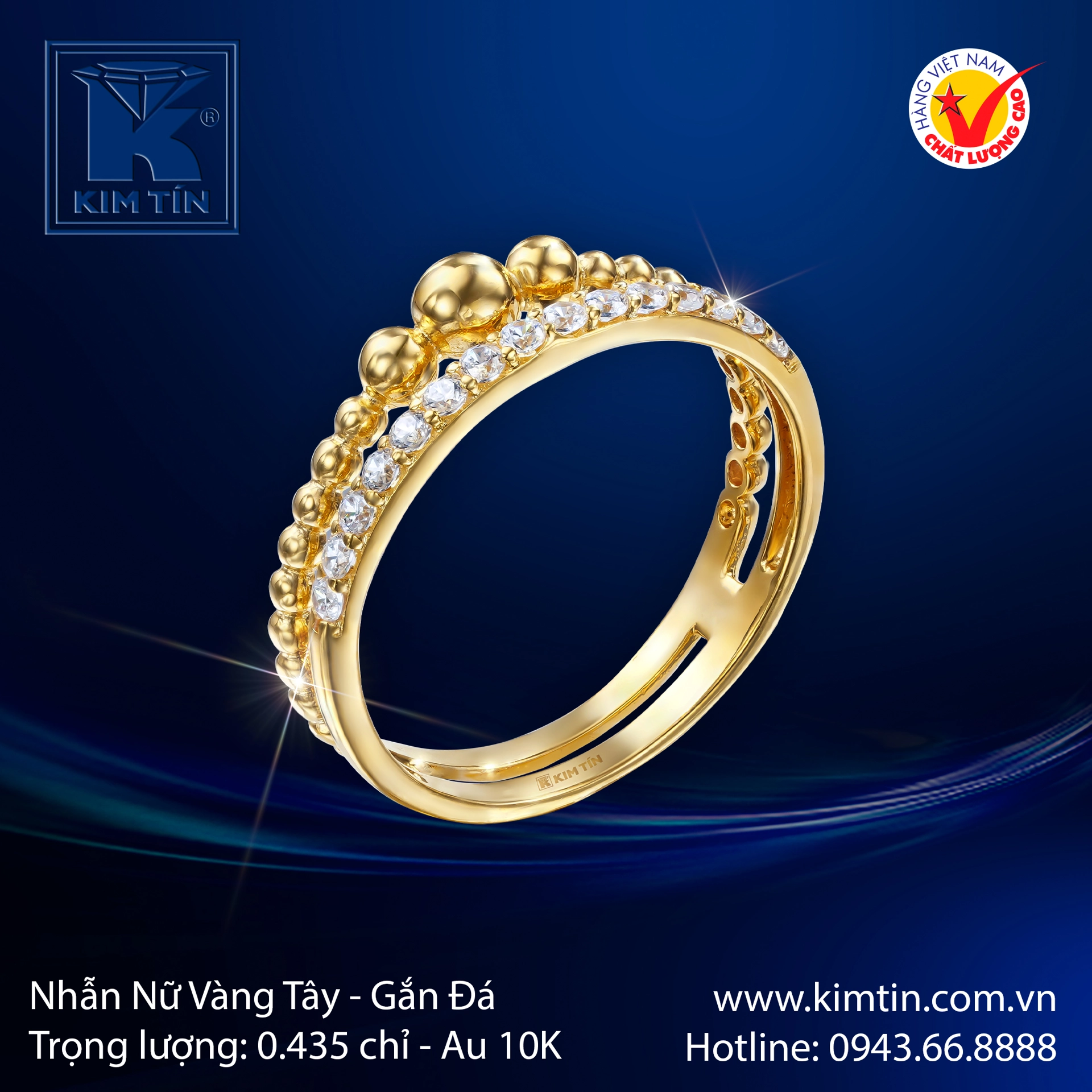 Nhẫn được chế tác từ Vàng Tây 10K (Au 416), có độ bền và độ cứng cao, với sắc vàng rực rỡ, ấm áp. Với trọng lượng tham khảo 0.435 chỉ, chiếc nhẫn mang lại cảm giác thoải mái, nhẹ nhàng nhưng vẫn giữ được sự sang trọng, lấp lánh cần có.