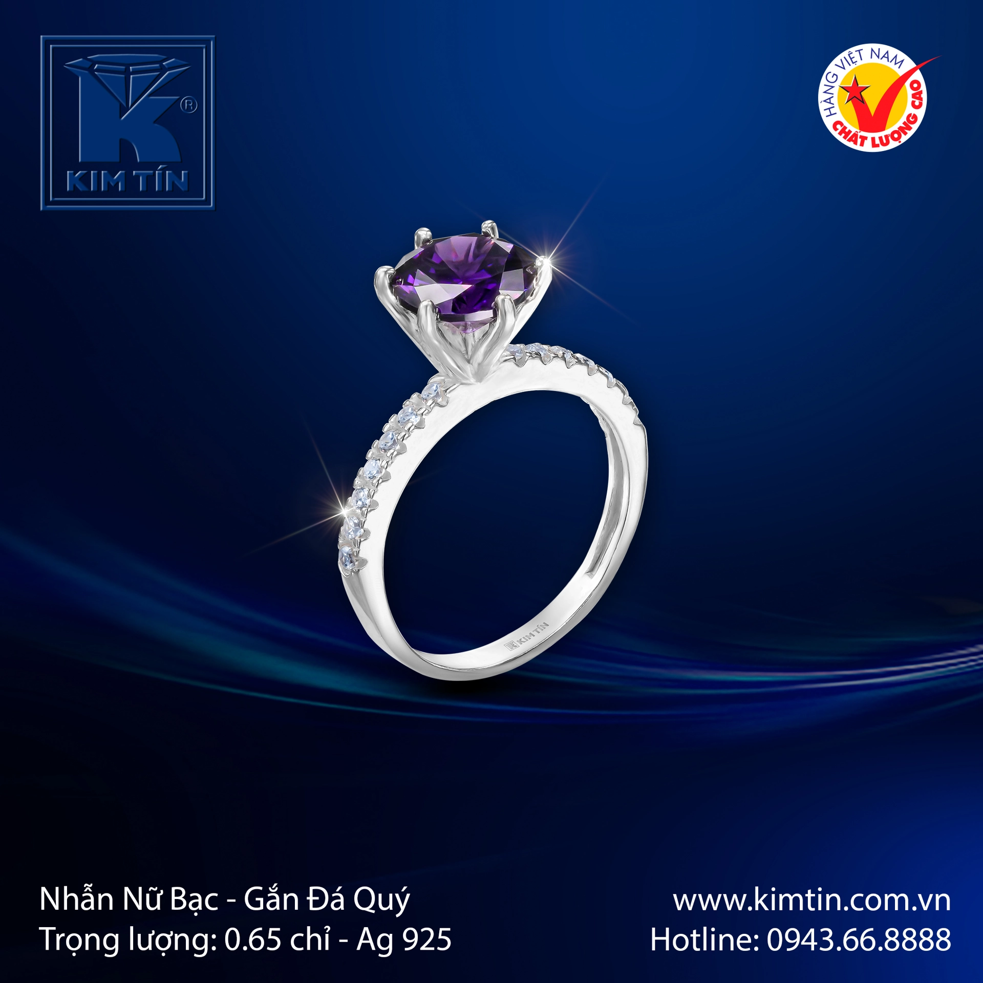 Chiếc nhẫn nữ bạc của Kim Tín là biểu tượng của Tình Yêu Duy Nhất và sự chung thủy vĩnh cửu (ý nghĩa Solitaire). Viên Đá Quý Màu Tím Đậm (Thạch Anh Tím - Amethyst) tròn, được cắt giác hoàn hảo, đặt trên chấu cao để hấp thụ ánh sáng tối đa, tỏa ra vẻ đẹp quý phái, huyền bí.