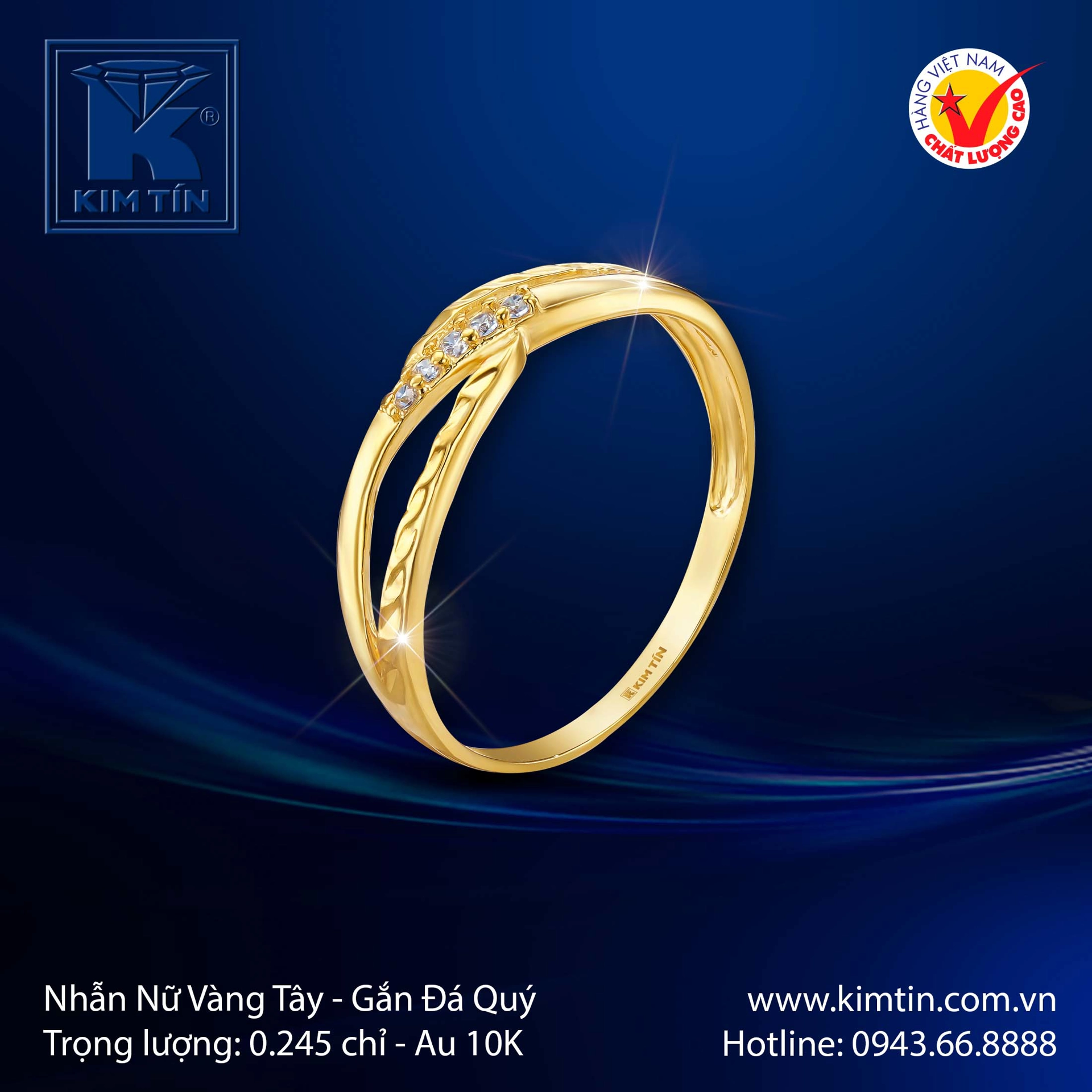 Nhẫn được chế tác từ Vàng Tây 10K (Au 416), nổi bật với sắc vàng ấm áp, tươi tắn. Với trọng lượng tham khảo nhẹ nhàng 0.245 chỉ, chiếc nhẫn mang lại cảm giác thanh thoát, lý tưởng để đeo hàng ngày.