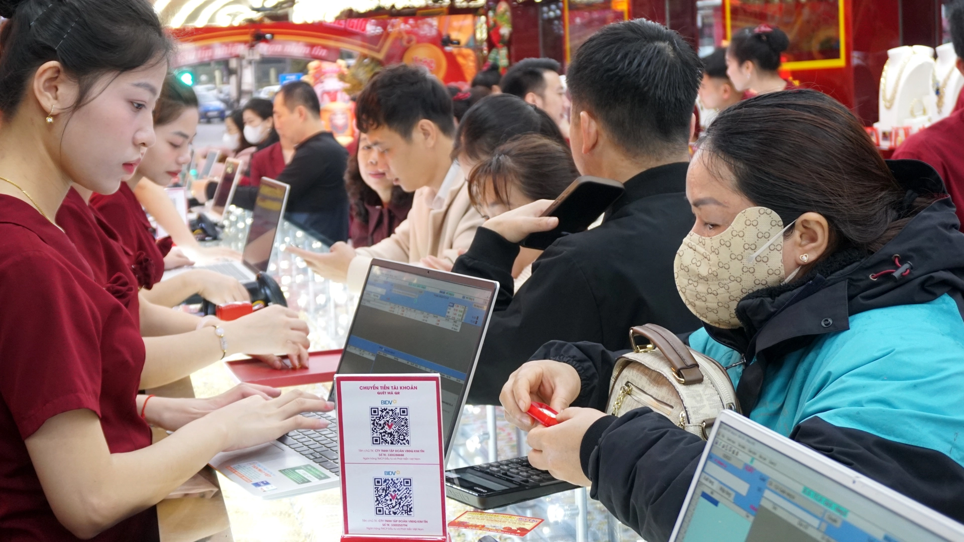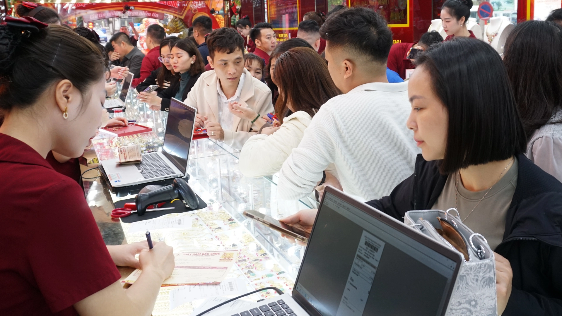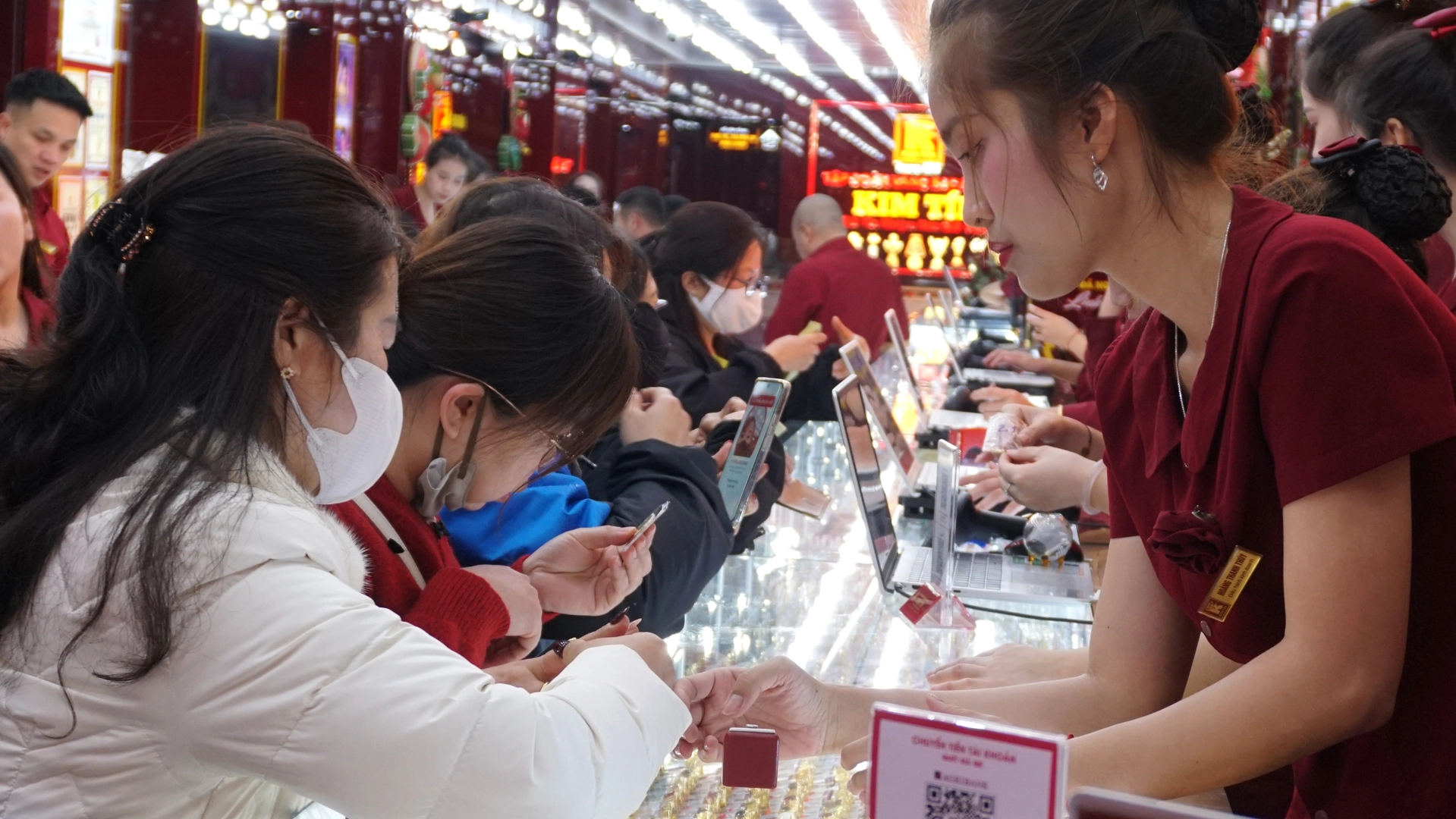 Lượng khách tiếp tục tăng mạnh, phủ kín không gian cửa hàng. Hoạt động mua bán diễn ra liên tục. Kim Tín đã chuẩn bị lượng hàng lớn từ sớm với đa dạng sản phẩm: vàng nhẫn 999,9, nhẫn Kim Tiền, miếng vàng tài lộc, vàng hình con giáp, trang sức vàng ta, vàng tây, trang sức đính đá quý,… nhiều trọng lượng để khách hàng thoải mái lựa chọn đón lộc đầu năm.