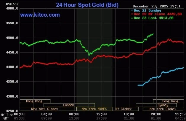 Giá vàng thế giới hôm nay tiếp tục tăng mạnh, chính thức vượt mốc 4.500 USD/ounce trong bối cảnh căng thẳng địa chính trị leo thang và nhu cầu trú ẩn an toàn gia tăng. Chốt phiên giao dịch ngày 23/12, giá vàng thế giới giao ngay tăng 41 USD, lên 4.483 USD/ounce. Bước sang phiên sáng 24/12, đà tăng chưa có dấu hiệu dừng lại khi kim loại quý này thiết lập đỉnh cao kỷ lục mới tại 4.516 USD/ounce.