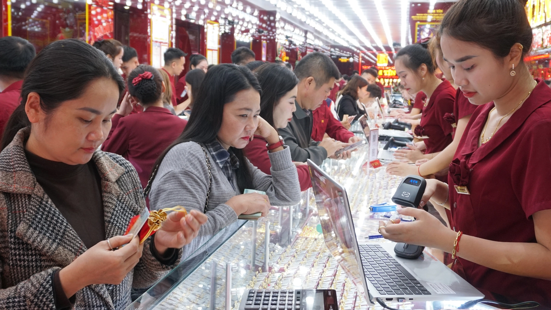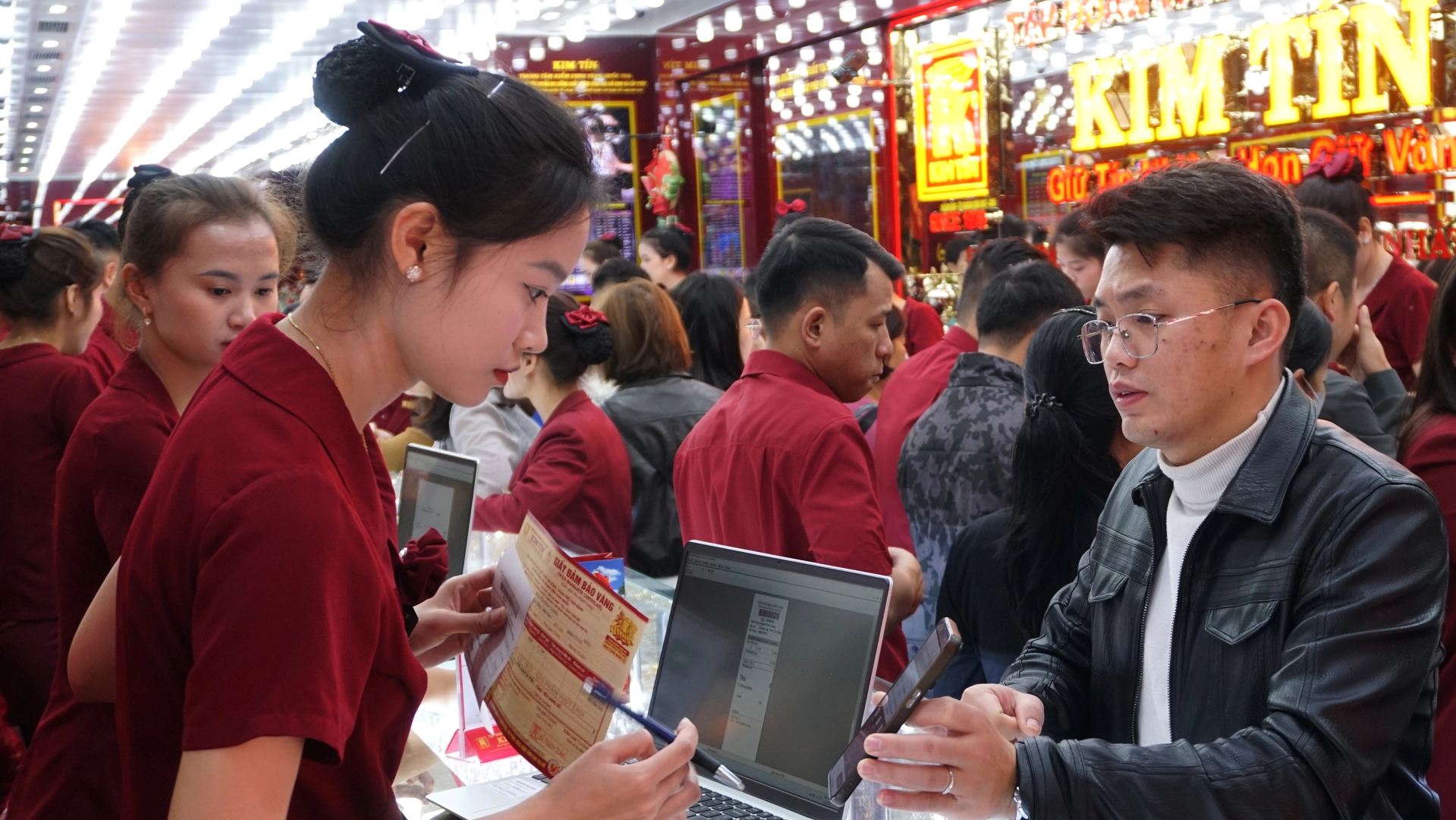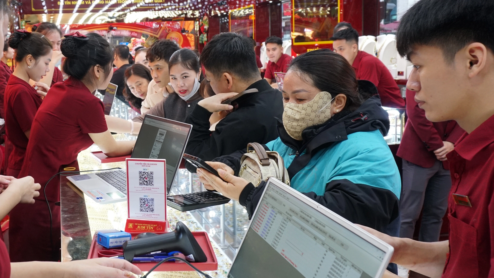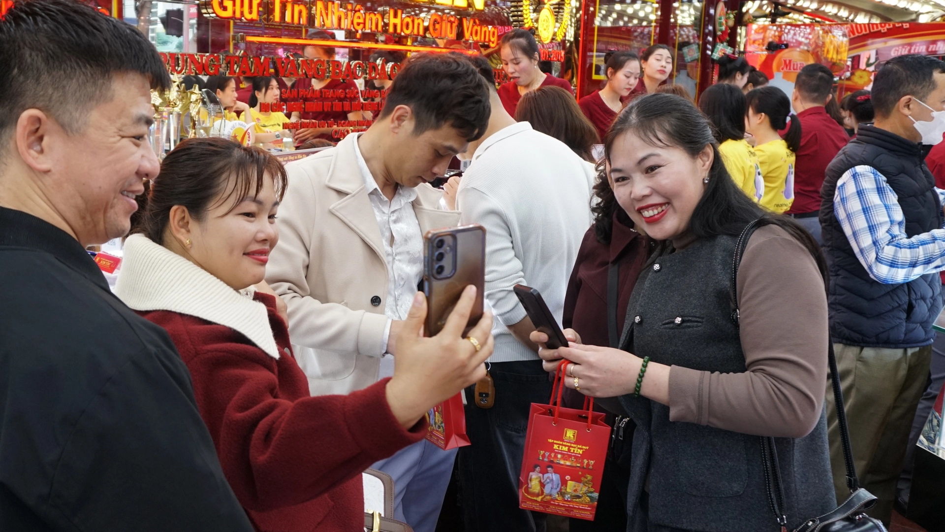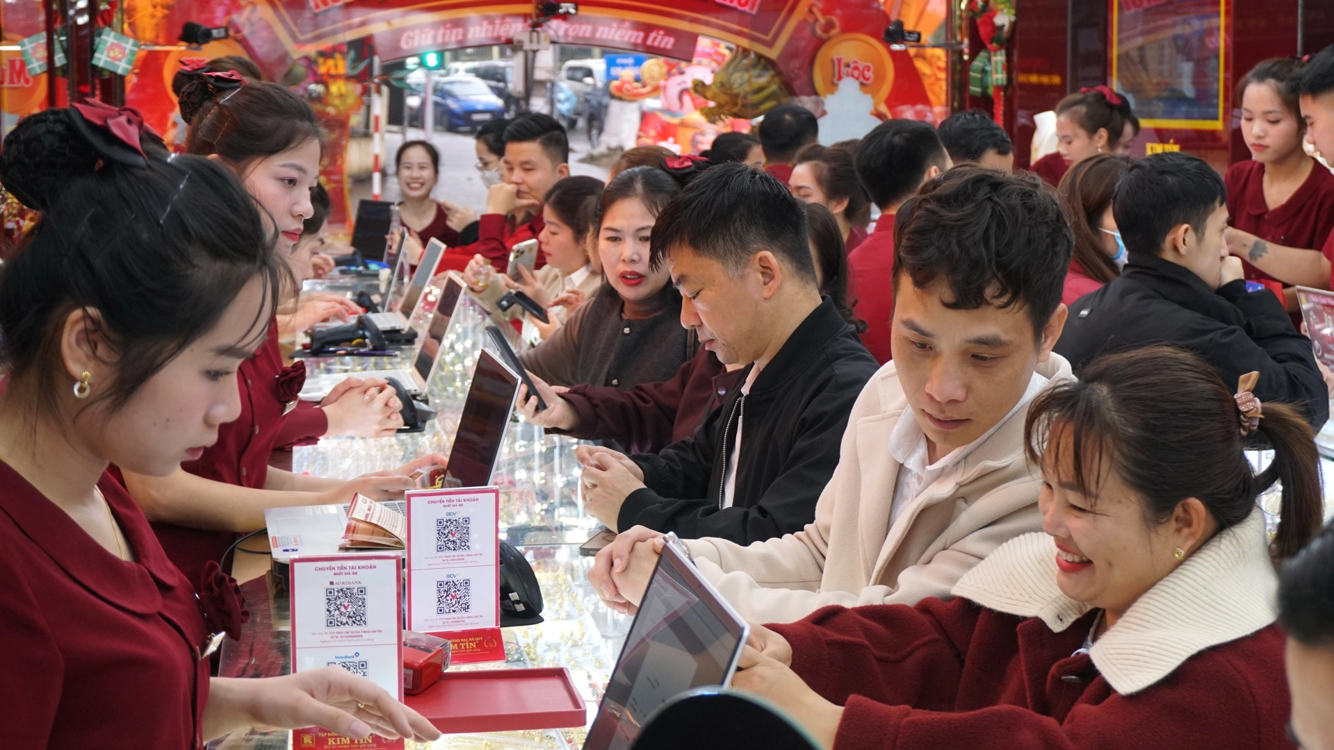 Lượng khách tiếp tục tăng mạnh, phủ kín không gian cửa hàng. Hoạt động mua bán diễn ra liên tục. Kim Tín đã chuẩn bị lượng hàng lớn từ sớm với đa dạng sản phẩm: vàng nhẫn 999,9, nhẫn Kim Tiền, miếng vàng tài lộc, vàng hình con giáp, trang sức vàng ta, vàng tây, trang sức đính đá quý,… nhiều trọng lượng để khách hàng thoải mái lựa chọn đón lộc đầu năm.